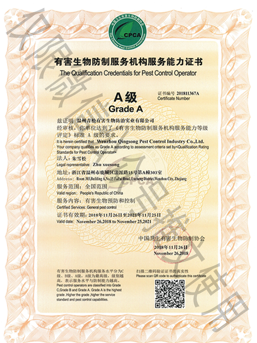 國(guó)家級(jí)有害生物防制認(rèn)證機(jī)構(gòu)A級(jí)證書/浙江省病媒生物防制服務(wù)機(jī)構(gòu)能力等級(jí)一級(jí)資質(zhì)