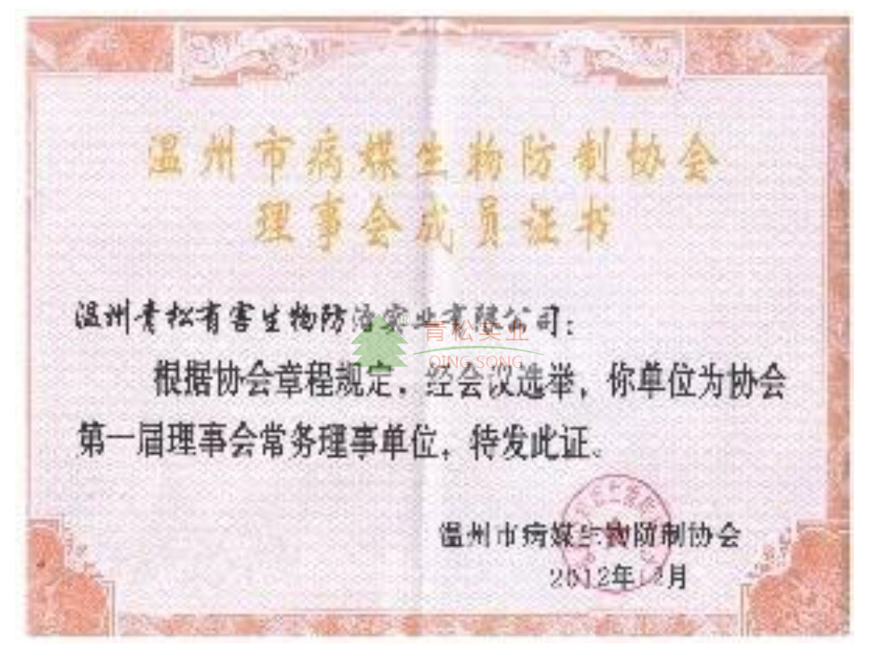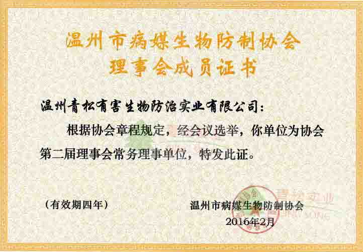 溫州市病媒生物防治協會理事會成員證書