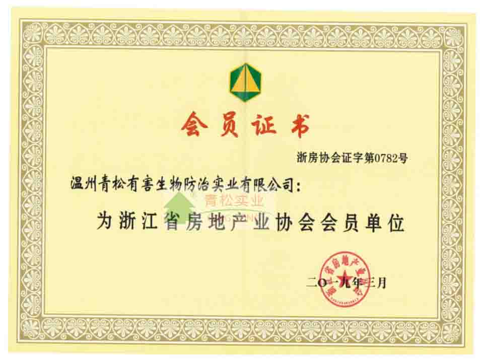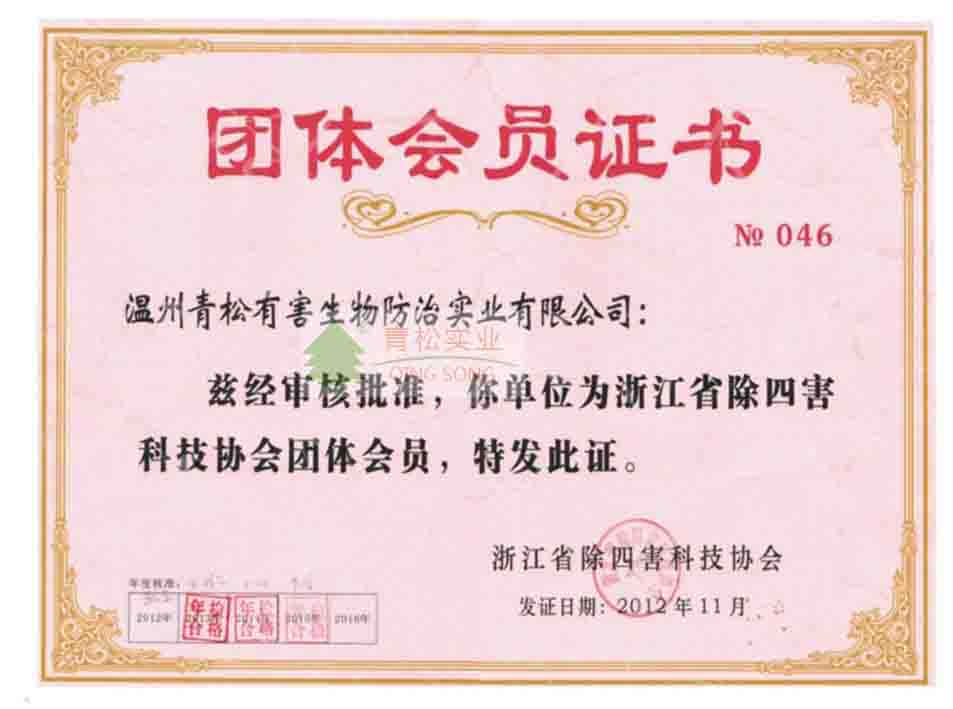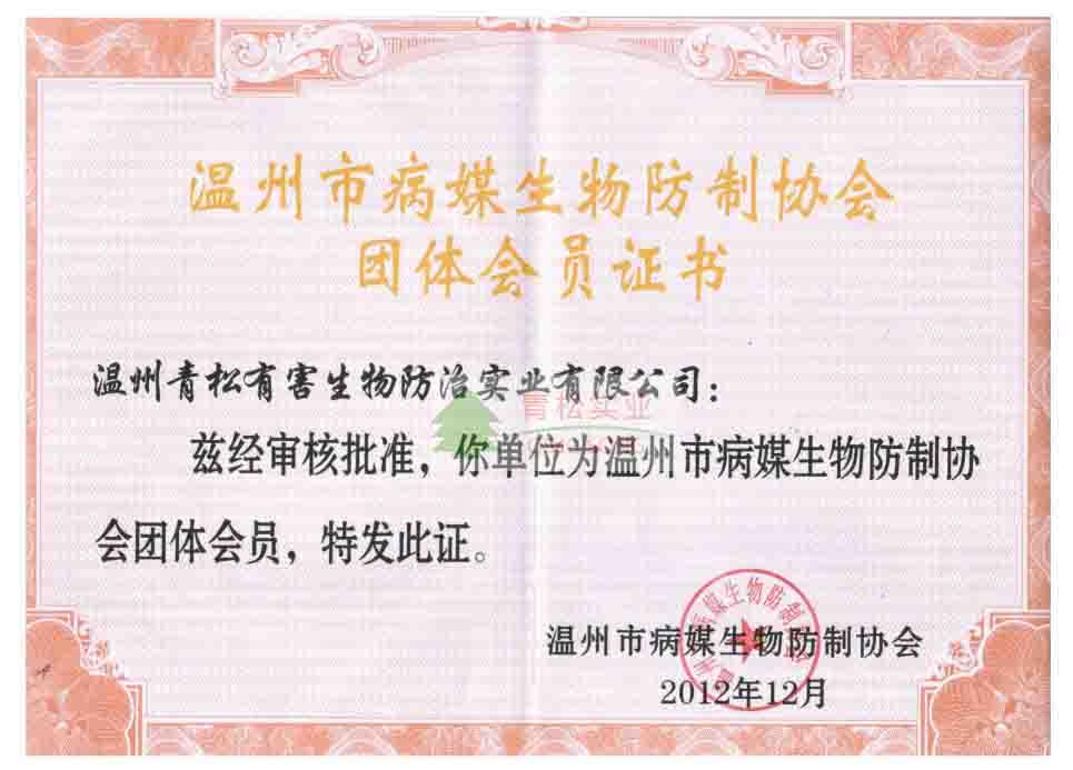 溫州市病媒生物防治協會團體會員證書